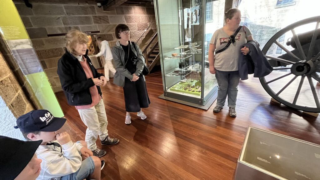 We then went for a walk in the nearby Rocks neighbourhood. Séverine found a nice family restaurant for lunch. Thomas and his family joined us after lunch, together with Sam, Nathalie’s sister. We were lucky to arrive at the Rocks Discovery Museum just as a guided tour started, and got to learn about local aboriginal Australians (Cadigals), and about the history of the first convicts settling in the area. The locals were decimated by the virus brought by the English fleet, and pushed outside what now is the Sydney area.