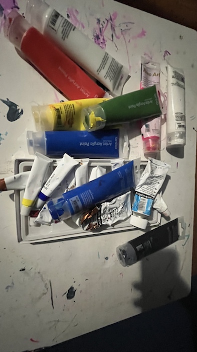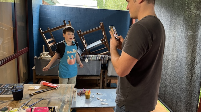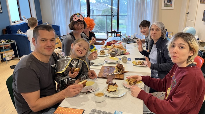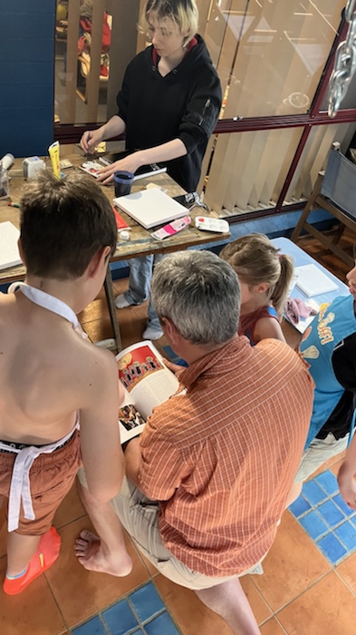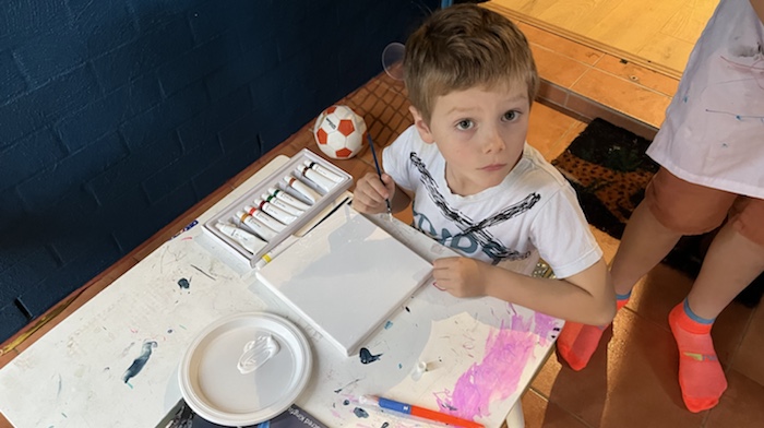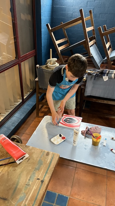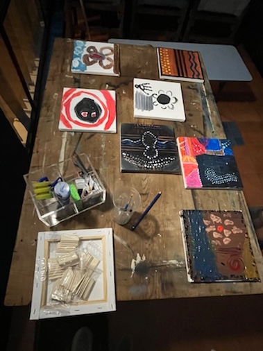 We got started with the paintings after lunch. Matilda painted « People Around the Fire », Timo « Newcastle », Hugo « The Immortal Mask », Tom « Nine over Newie », Sarah « Spider », Guillaume « The Roots of Daytime», and Alfie « Sun – Flower ». Nathalie made cinnamon rolls while we were painting – strangely enough, they looked closer to aboriginal art than any of our paintings.