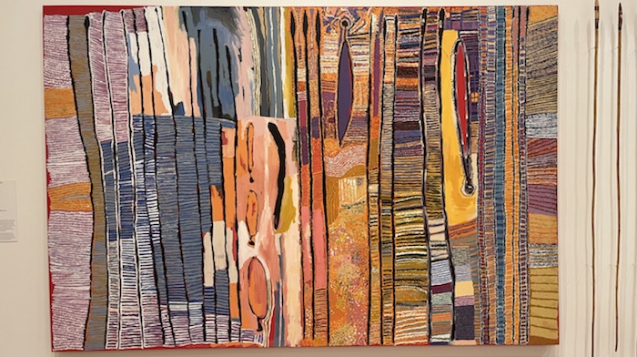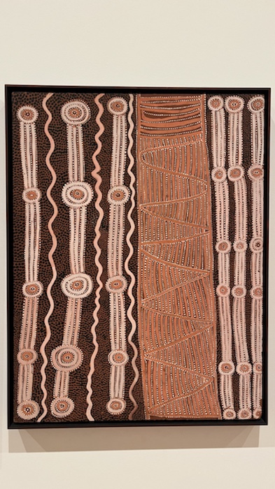 After a quick lunch break along the South Bank, we went to a guided tour of the nearby Art Gallery, taking us through Australian masterpieces of the last 150 years or so, and beautiful aboriginal art from the last 50 years. I understand (but maybe I misunderstood) that Aboriginal Australians only started painting on canvas in the 70s, pretty recently, really. We learnt that, although it looked like abstract art, it’s not – the artist tells a story, a story they own.